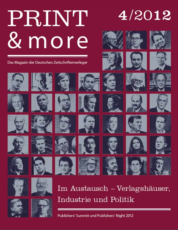 Frisch gedruckt und mit einer Vielzahl an Neuigkeiten, Meinungen und Berichten auf 48 Seiten ist heute die neue, vierte Ausgabe der PRINT & more in diesem Jahr erschienen. Das Magazin der Deutschen Zeitschriftenverleger steht diesmal im Zeichen des Publishers‘ Summit und der Publishers‘ Night – zwei der wichtigsten Medienveranstaltungen des Jahres, die erneut eine wichtige Plattform des Dialogs zwischen Politik und Medien waren.