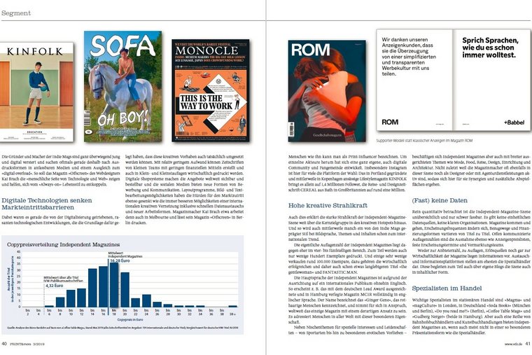 Ein Ergebnis davon ist zum Beispiel das Gesellschaftsmagazin „ROM“, das von Menschen in der digitalisierten Welt berichtet und für dessen Gestalter das Digitale ganz selbstverständlich Teil ihres Lebens ist. Die Zeitschrift ist wie viele andere Neugründungen ein „Independent Magazine“. Und deren Gründer, Gestalter und Journalisten bilden eine lebendige Szene mit großer Vielfalt und Schaffenskraft. Sowohl international als auch in Deutschland haben sich die unabhängigen Zeitschriften eine ganz eigene Fan-Gemeinde erarbeitet, mit eigenen Dienstleistern für Verlagsservices, eigenen Events, Podcasts und Handelsformen. Und für viele Kreative sind sie mittlerweile eine überaus wichtige Inspirationsquelle für ihre Arbeit geworden.