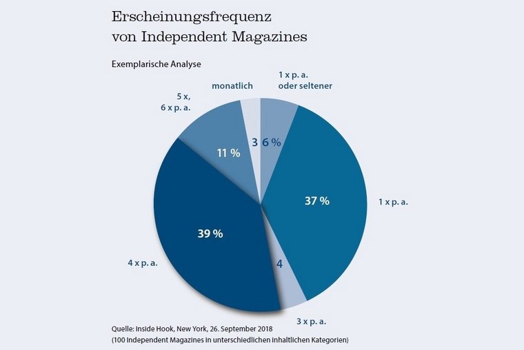 Eine Angebotsanalyse der Spezialshops zeigt aber zwei klare Unterschiede zum etablierten Magazin-Segment: Zum einen ist die Erscheinungsfrequenz durchweg niedrig. Die Magazine erscheinen oftmals nur ein bis zwei Mal im Jahr, eine vierteljährliche Erscheinungsweise kann bereits als hoch bezeichnet werden. Eine monatliche Frequenz, wie sie einer der Klassiker der Szene, das Magazin „Monocle“, mit zehn Ausgaben und zwei Sonderheften im Jahr aufweist, ist die absolute Ausnahme.