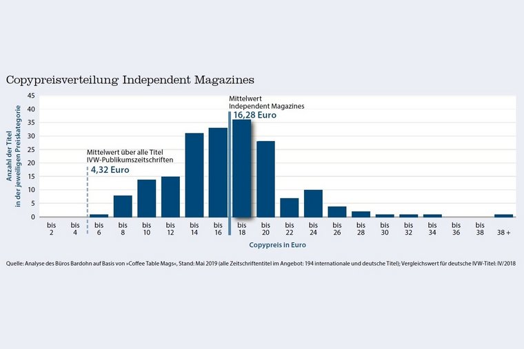 Auf der anderen Seite sind die Copypreise der Indie Mags durchweg hoch. Eine exemplarisch durchgeführte Analyse des Online-Shop von „Coffee Table Mags“ ergibt einen Durchschnittspreis von 16,28 Euro. Zum Vergleich: Für alle IVW-gemeldeten Publikumszeitschriften liegt der durchschnittliche Copypreis bei 4,32 Euro*. Einzelne Independent Magazines können auch 25 Euro und mehr kosten und haben in einigen Fällen sogar einen noch höheren Sammlerwert für besondere Ausgaben.