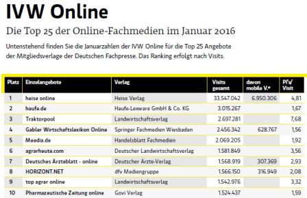 Die landwirtschaftlichen Titel legen auch im Januar wieder zu. So gewinnt agrarheute.com (Deutscher Landwirtschaftsverlag) weitere 283.000 Visits (+22 Prozent) und top agrar online (Landwirtschaftsverlag) wächst um knapp 208.000 zusätzliche Visits (+15 Prozent) im Vergleich zum Vorjahr. Die Platzierungen der Netzwerke für Onlinefachinformationen bleiben überwiegend konstant zum Vorjahr.  Einen leichten Zuwachs von knapp 60.000 zusätzlichen Visits (+13 Prozent) kann der Handwerks-Channel (Holzmann Medien) im Vergleich zum Vorjahr verbuchen.  Die monatlich zusammengestellte Tabelle gibt einen Überblick über die Top 25-Onlineangebote deutscher Fachmedienverlage (nur Mitgliedsverlage). Mehr Informationen und die vollständige Tabelle.