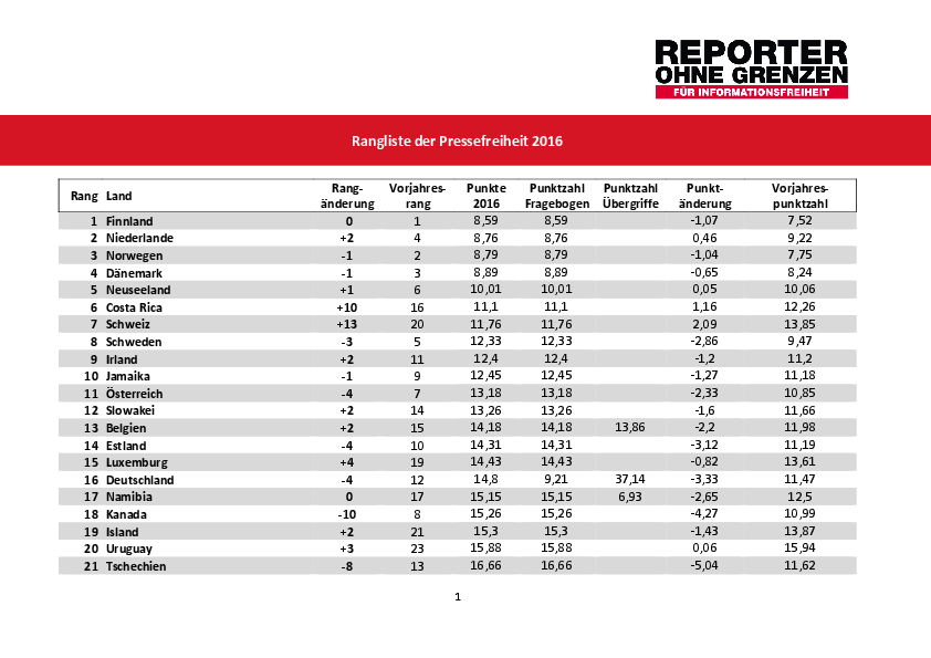 Alle Informationen zur ROG-Rangliste sind unter reporter-ohne-grenzen.de/rangliste sowie unter http://t1p.de/enrw abrufbar.
