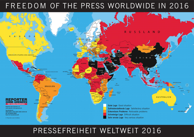 Journalisten und unabhängige Medien stehen weltweit unter zunehmendem Druck. In allen Weltregionen ist im vergangenen Jahr ein Rückgang ihrer Freiräume zu beobachten gewesen. Das geht aus der Rangliste der Pressefreiheit 2016 hervor, die Reporter ohne Grenzen am Mittwoch veröffentlicht hat. Zunehmend autokratische Tendenzen in Ländern wie Ägypten, Russland oder der Türkei tragen zu diesem Trend ebenso bei wie die bewaffneten Konflikte etwa in Libyen, Burundi und dem Jemen. Negativ wirken sich auch die Bestrebungen der Regierungen in Ländern wie Polen und Ungarn aus, staatliche und private Medien unter ihren Zugriff zu bringen.