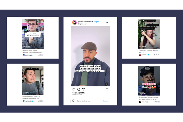 Die erfolgreichen Creators dassistjay, Professorfinanzen, mylifeasjul, Marvintsp und Itsmanjuu setzen unter dem Hashtag #PressefreiheitIstDeineFreiheit ein Zeichen für Pressefreiheit und Meinungsvielfalt und zeigen ebenfalls den schmalen Grat zwischen Meinungsfreiheit und Hate Speech auf. Ziel ist es, die Digital Natives der Gen Z für das Thema zu sensibilisieren und eine differenzierte Perspektive gegenüber Social Media Beiträgen einzunehmen: Warum sind Presse- und Meinungsfreiheit ein so wichtiger Bestandteil unserer freiheitlich demokratischen Grundordnung? Wo hört die Meinungsfreiheit auf und wo fängt Beleidigung an? Und wie würde eine Gesellschaft ohne Pressefreiheit aussehen?