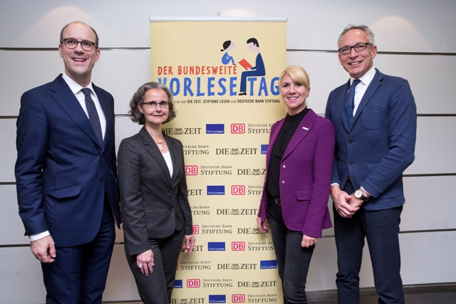 Für die mittlerweile 10. Vorlesestudie wurden die Kinder selbst befragt. Die Ergebnisse präsentierten die Initiatoren heute in Berlin: Dr. Jörg F. Maas, Hauptgeschäftsführer Stiftung Lesen, Dr. Simone C. Ehmig, Leiterin Institut für Lese- und Medienforschung, Manuel Hartung, Ressortleiter Chancen DIE ZEIT, sowie Antje Neubauer, Vorsitzende Fachkuratorium Bildung Deutsche Bahn Stiftung. Die Initiatoren riefen auch zur Teilnahme am 13. Bundesweiten Vorlesetag auf, der in diesem Jahr am 18. November stattfindet.