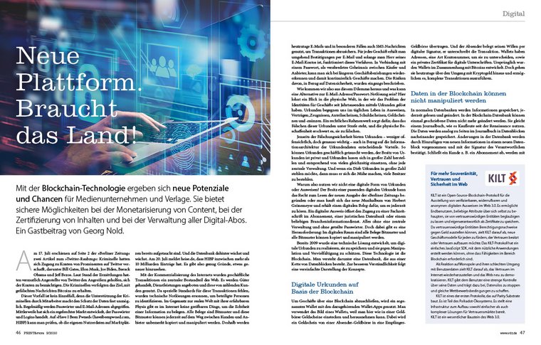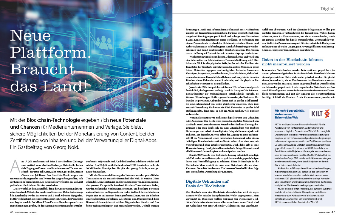 Mit der Blockchain-Technologie ergeben sich für Medienunternehmen neue Potenziale. Sie bietet sichere Möglichkeiten bei der Monetarisierung von Content, bei der Zertifizierung von Inhalten und bei der Verwaltung von Digital-Abos. Wie das mithilfe von digitalen Urkunden auf Basis der Blockchain funktioniert, erklärt Heise-CTO Georg Nold in seinem Gastbeitrag „Neue Plattform – Braucht das Land!“