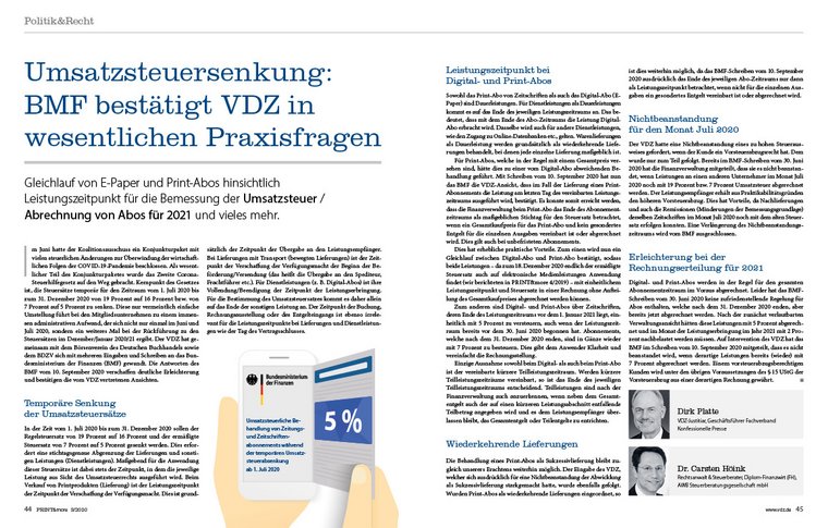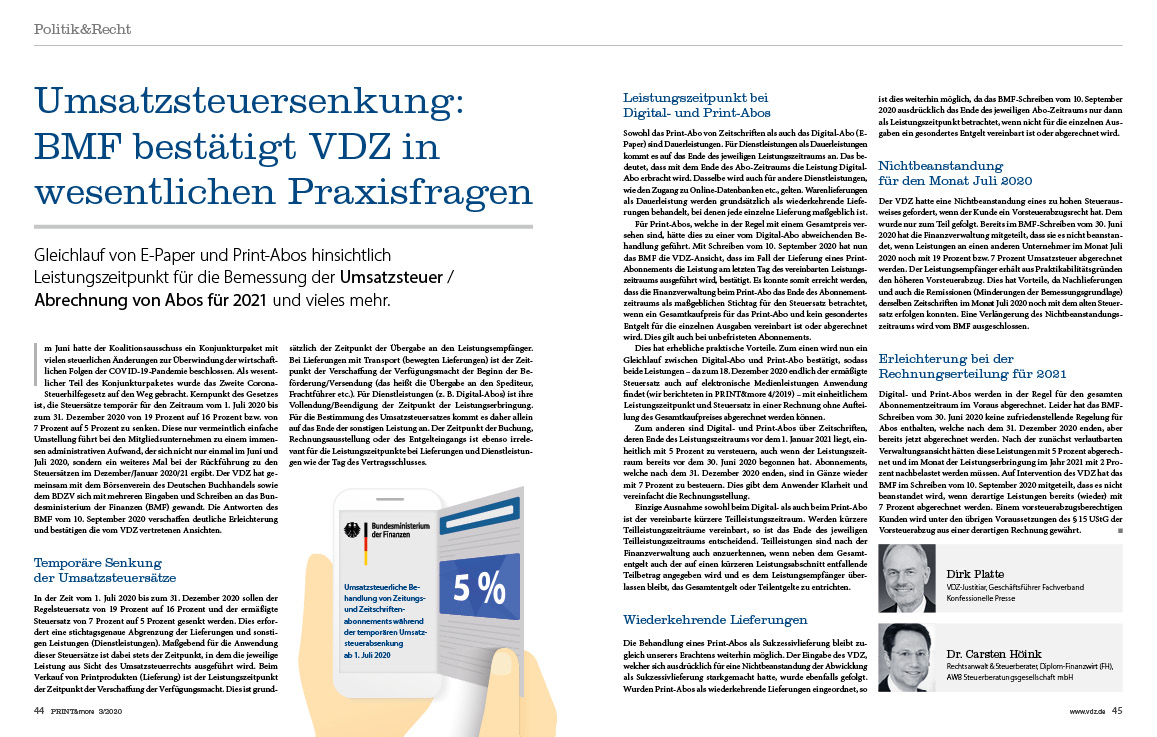 Als „Drehscheibe in Krisenzeiten“ beschreibt Stephan Scherzer den VDZ: Die vergangenen Monate zeigten, wie wichtig eine starke, gemeinschaftliche Branchenvertretung ist. Die Erfolge in der Medienpolitik, in der Tarif- und in der Steuerpolitik („Umsatzsteuersenkung: BMF bestätigt VDZ in wesentlichen Praxisfragen“) sprechen für sich.