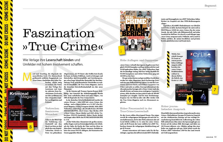 Die deutsche Zeitschriftenlandschaft ist einzigartig und höchst vielfältig. Das bestätigt die 15-seitige News-Strecke mit zahlreichen Branchenmeldungen aus dem letzten Quartal. Die Verlage kennen die Bedürfnisse und Interessen ihrer Leserschaft sehr genau und adressieren diese modern auf allen Kanälen. Das ist auch das Erfolgsrezept des boomenden True-Crime-Segments und seiner stetig wachsenden, zumeist weiblichen Fangemeinde. „Am Kiosk“ steht in diesem Heft „stern Crime“-Redaktionsleiter Giuseppe Di Grazia: Er berichtet über sein Lieblingsmagazin, das seiner Meinung nach das Storytelling neu erfunden habe und Geschichten als Gesamtkunstwerke erzähle. Im Oktober feiert der Bergmoser + Höller Verlag sein 50. Jubiläum. Das große Portfolio pädagogischer Fachzeitschriften des Medienhauses ist Ergebnis unternehmerischen Mutes, erfinderischer Ideen und redaktioneller Unabhängigkeit, worüber das Verlagsporträt berichtet.
