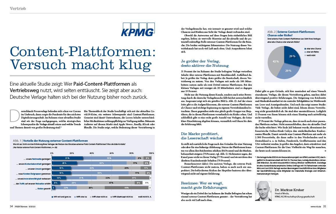 Ein visionäres Gedankenexperiment, um die Entwicklung der Branche mitzugestalten, ist das „Presseregal der Zukunft“. Es zeigt, wie beim Presseverkauf ein echtes Erlebnis geschaffen werden kann, denn der Umsatz vom Leser wird auch in Zukunft sehr relevant sein. Aktuelle Branchentrends und Paid-Content-Plattformen als Vertriebswege zeigt die exklusive Preview der neuen VDZ-Studie, die zusammen mit KPMG und der Ludwig-Maximilians-Universität München im Oktober veröffentlicht wird.