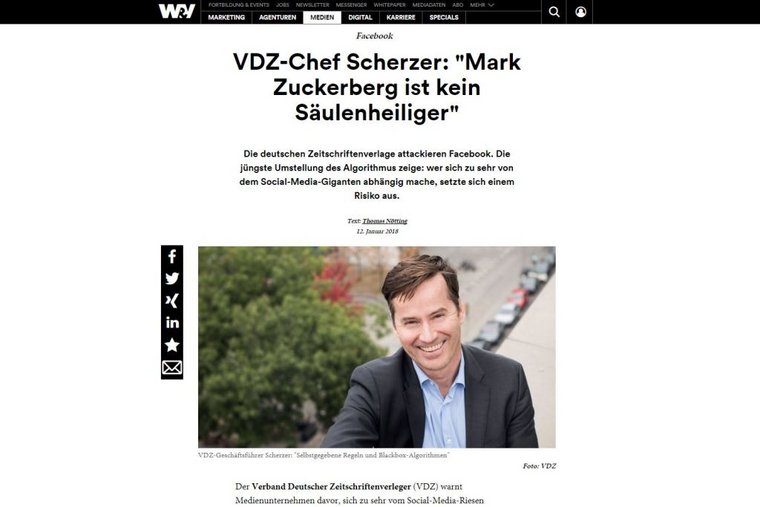 Der VDZ warnt Medienunternehmen davor, sich zu sehr vom Social-Media-Riesen Facebook abhängig zu machen. Anlässlich der neuen Ausrichtung des Facebook-Newsfeeds erklärt VDZ-Hauptgeschäftsführer Stephan Scherzer: „Der mit über zwei Milliarden Nutzern größte öffentliche Kommunikationsraum der Welt arbeitet nach selbstgegebenen Regeln und mit Black-Box-Algorithmen. Entscheidungen werden global verkündet, umgesetzt und nicht diskutiert. Wer mit eigenen Geschäftsmodellen zu sehr auf die Silicon-Valley-Giganten setzt, setzt sich stets dem Risiko solcher Entscheidungen aus“.