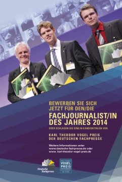 Die Ausschreibung zum Award "Fachjournalist des Jahres 2014" ist gestartet. Fachjournalistische Expertise zählt zu den zentralen Eigenschaften guter Fachmedien – und macht sich bezahlt. Der mit 15.000 Euro dotierte Award steht für hervorragende Recherchearbeit, sprachliche und stilistische Exzellenz und das richtige fachjournalistische Gespür. Journalisten können selbst geschriebene Beiträge einreichen, die 2013 in deutscher Sprache in einem Fachmedium (Deutschland, Österreich und Schweiz) veröffentlicht worden sind. Ausgeschlossen sind Beiträge aus Special-Interest-Titeln, Publikumszeitschriften, Tageszeitungen und Büchern. Erstmals können auch Fachjournalisten für die Ehrung von Dritten vorgeschlagen werden.