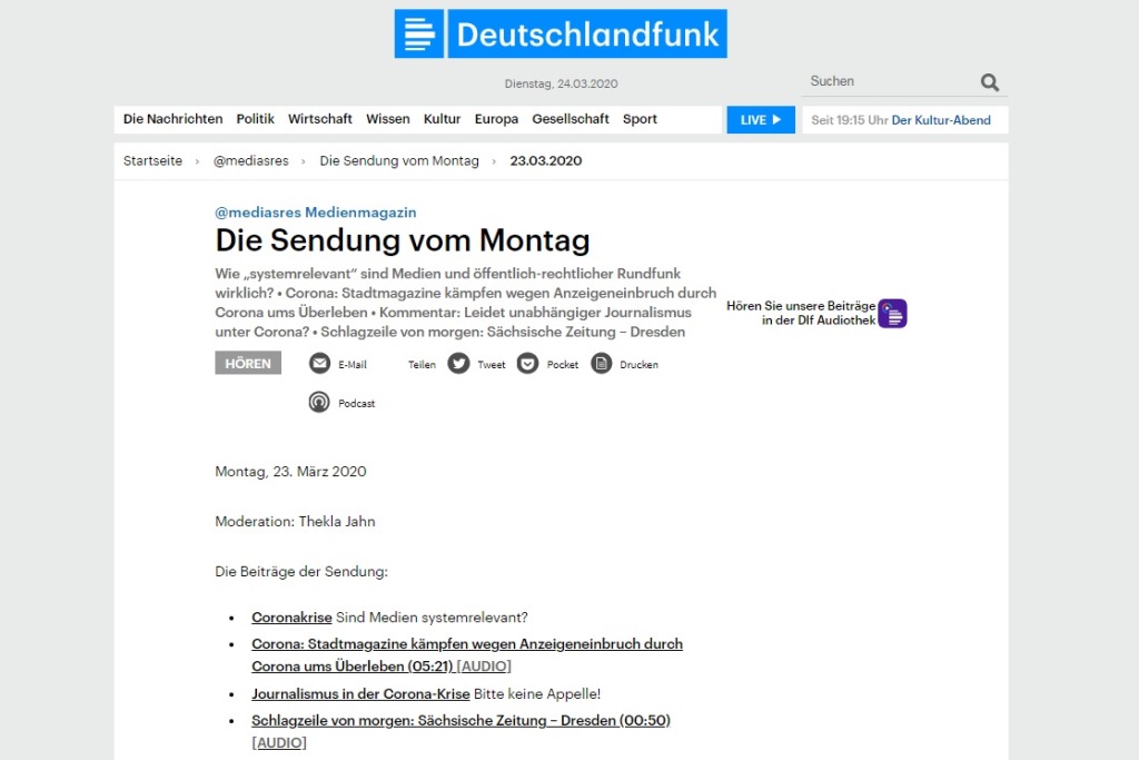 @mediasres Medienmagazin: Die Sendung vom Montag, 23.03.2020: