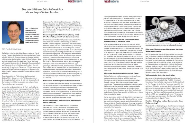 Die Vermarktungshoheit der Verlage über ihre journalistischen Produkte ist eine offenbare Existenzbedingung jeder Zeitschriften- und Zeitungspresse, die sich aus dem freien Verkauf ihrer Produkte an Leser und aus der Vermarktung an Werbungtreibende finanziert. Deshalb ist der Vorschlag einer Anerkennung der Presseverleger als Rechteinhaber im EU-Urheberrecht ebenso notwendig wie überfällig. Nachdem das EU-Parlament im September vergangenen Jahres mit großer Mehrheit für ein solches Recht votiert hat, dauern die Verhandlungen zwischen Parlament, Justizministerrat und Kommission über die endgültige Fassung zum Jahresende noch an. Stimmen im Rat, die das Recht so verwässern wollen, dass es die Verwertung der Presseprodukte durch Suchmaschinen und andere Aggregatoren gar nicht erfassen würde, dürfen sich nicht durchsetzen. Dafür kommt es auch darauf an, dass die Bundesregierung ein derart leerlaufendes Verlegerrecht unter keinen Umständen akzeptiert. Ein weiterer positiver Aspekt der Überarbeitung der EU-Urheberrechtsrichtlinie wird hoffentlich die Wiederermöglichung der Verlagsbeteiligung an Ausschüttungen wie derjenigen der VG-Wort sein.