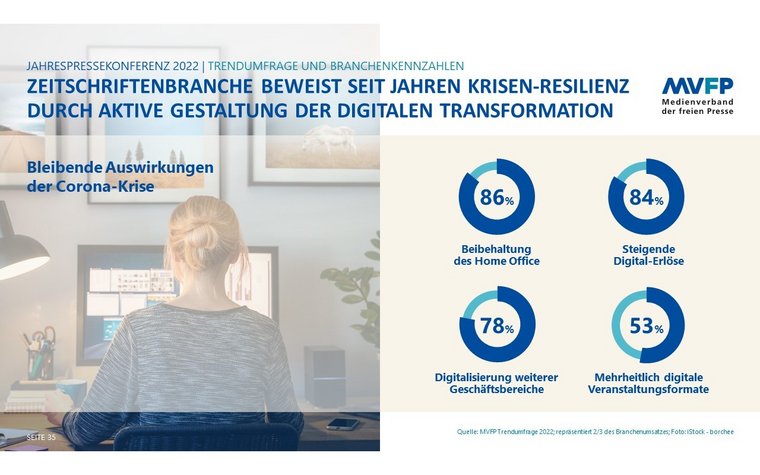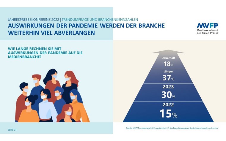 Bei der Einschätzung der Dauer der Auswirkungen durch die weiter andauernde Pandemie sind die Zeitschriftenverlage skeptischer als noch im Jahr zuvor. Laut MVFP-Trendumfrage geht die große Mehrheit (85 Prozent) von länger andauernden Folgen der Pandemie aus: 30 Prozent rechnen auch 2023 mit Auswirkungen, 37 Prozent noch länger und 18 Prozent sogar mit dauerhaften Folgen. Lediglich 15 Prozent sind der Meinung, dass diese in 2022 enden.