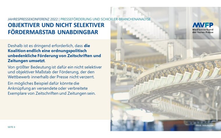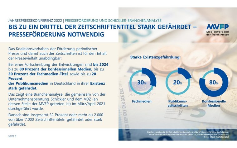 Bei Fortschreibung der aktuellen Entwicklungen sind bis 2024 30 Prozent der Zeitschriftentitel in ihrer Existenz stark gefährdet. Das sind über 2.000 von insgesamt über 7.000 Zeitschriftentiteln. Es handelt sich um bis zu 30 Prozent der Titel der Fachmedien, bis zu 80 Prozent der konfessionellen sowie bis zu 20 Prozent der Publikumsmedien in Deutschland. Das zeigt eine repräsentative Branchenanalyse, die die Unternehmensberatung Schickler mit dem VDZ, an dessen Stelle im April der MVFP getreten ist, im März/April 2021 durchgeführt hat. Weil in dieser Analyse weder die jüngsten Steigerungen der Papierpreise von bis zu 150 Prozent noch das Ausmaß der Erhöhung des Mindestlohns in 2022 noch die extrem gestiegenen Energiekosten berücksichtigt sind, ist die konkrete ökonomische Bedrohung einzelner Titel und ganzer Verlage deutlich akuter.