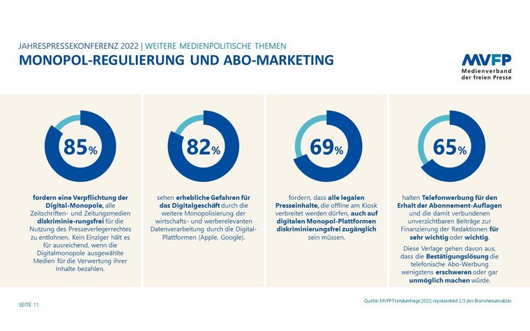 Wie die Trendumfrage weiter zeigt, hat für die MVFP-Mitgliedsverlage die Sicherstellung fairer Wettbewerbsbedingungen gegenüber den Torwächterplattformen und deren wirksame Regulierung sehr große Bedeutung. So fordern 85 Prozent eine Verpflichtung der Digitalmonopole, alle Zeitschriften und Zeitungen diskriminierungsfrei für die Nutzung des Presseverlegerrechts zu entlohnen. Kein einziger hält es für ausreichend, wenn die Digitalmonopole nach Gutsherrenart ausgewählte Medien für die Verwertung ihrer Inhalte bezahlen. 82 Prozent sehen erhebliche Gefahren für das digitale Verlagsgeschäft durch die weitere Monopolisierung der wirtschafts- und werberelevanten Datenverarbeitung durch Digital-Plattformen wie Apple und Google.
