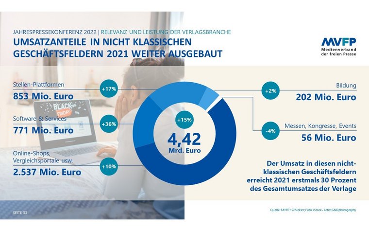 Wie die bereits zum vierten Mal von der Schickler Unternehmensberatung im Auftrag des MVFP ermittelten Umsatzerlöse der MVFP-Mitgliedsverlage in den Bereichen Veranstaltungen, Bildung, Software und Services, Stellen- und Transaktionsplattformen zeigen, haben sich 2021 die Umsätze in nahezu allen Bereichen der sonstigen Geschäftsfelder wieder deutlich erhöht. Insgesamt erwirtschafteten die Verlage damit 4,42 Mrd. Euro nach 3,84 Mrd. Euro in 2020. Den weitaus größten Anteil machten mit 2,54 Mrd. Euro (2020: 2,29 Mrd. Euro) die Transaktionsplattformen aus, also jene Erlöse, die über Kanäle wie E-Commerce, Vergleichsportale und Online-Rubriken-Märkte hereinkamen. Über den Bereich Bildung wurden Umsätze in Höhe von 202 Mio. (2020: 97 Mio.) Euro, über Veranstaltungen 58 Mio. Euro (2020: 56 Mio. Euro) sowie über Stellen-Plattformen 853 Mio. (2020: 731 Mio. Euro) erzielt. Das Geschäftsfeld Software und Services legte 2021 mit plus 36 Prozent deutlich und steigerte seinen Umsatz auf 771 Mio. Euro (2020: 566 Mio. Euro).