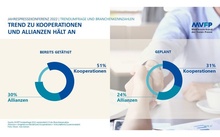 Genutzt hat den Medienhäusern im Transformationsprozess auch die weiter verstärkte Zusammenarbeit: Wie die MVFP-Trendumfrage zeigt, sind mittlerweile 51 Prozent Kooperationen eingegangen, 30 Prozent haben Allianzen geschmiedet. Die Zusammenarbeit innerhalb der Branche wollen die Zeitschriftenhäuser noch weiter vorantreiben: 31 Prozent planen, künftig Kooperation einzugehen, und 24 Prozent haben Allianzen für die Zukunft geplant.