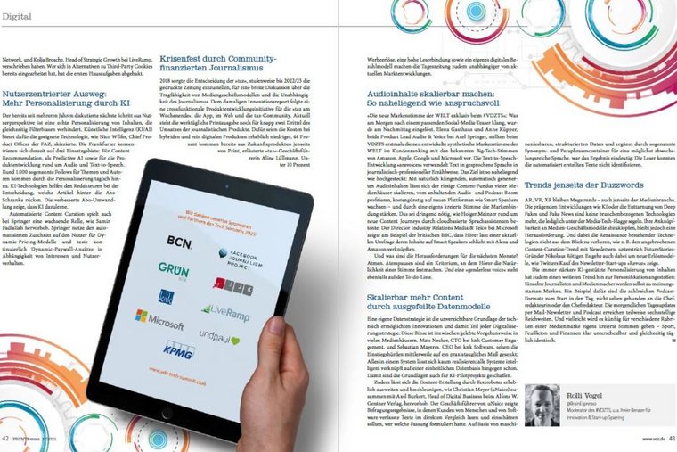 Die immer stärkere KI- gestützte Personalisierung von Inhalten hat zudem einen weiteren Trend hin zur Personifikation angestoßen: Einzelne Journalisten und Medienmacher werden selbst zu meinungsstarken Marken. Ein Beispiel dafür sind die zahlreichen Podcast-Formate zum Start in den Tag, nicht selten gebunden an die Chefredakteurin oder den Chefredakteur. Die morgendlichen Tagesupdates per Mail-Newsletter und Podcast erreichen teilweise sechsstellige Reichweiten. Und vielleicht wird es künftig für verschiedene Rubriken einer Medienmarke eigens kreierte Stimmen geben – Sport, Feuilleton und Finanzen klar unterscheidbar und gleichzeitig täglich identisch.