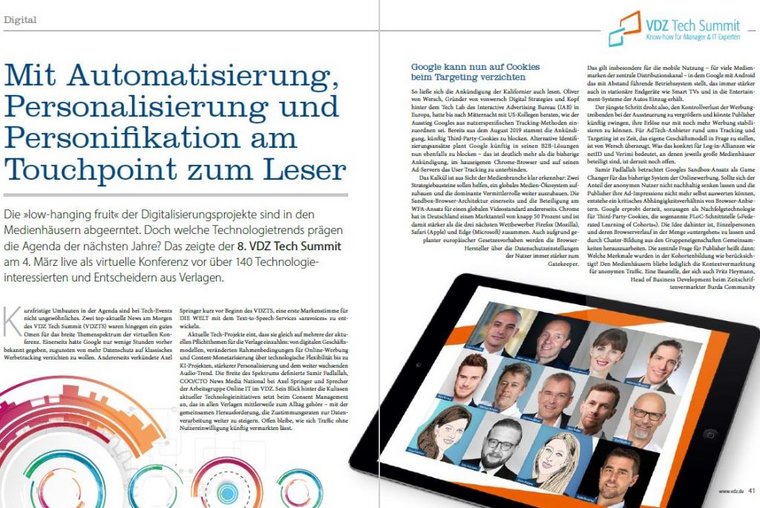 Kurzfristige Umbauten in der Agenda sind bei Tech-Events nichts Ungewöhnliches. Zwei topaktuelle News am Morgen des VDZ Tech Summit (VDZTS) waren hingegen ein gutes Omen für das breite Themenspektrum der virtuellen Konferenz. Einerseits hatte Google nur wenige Stunden vorher bekannt gegeben, zugunsten von mehr Datenschutz auf klassisches Werbetracking verzichten zu wollen. Andererseits verkündete Axel Springer kurz vor Beginn des VDZTS, eine erste Markenstimme für DIE WELT mit dem Text-to-Speech-Services „aravoices“ zu entwickeln.