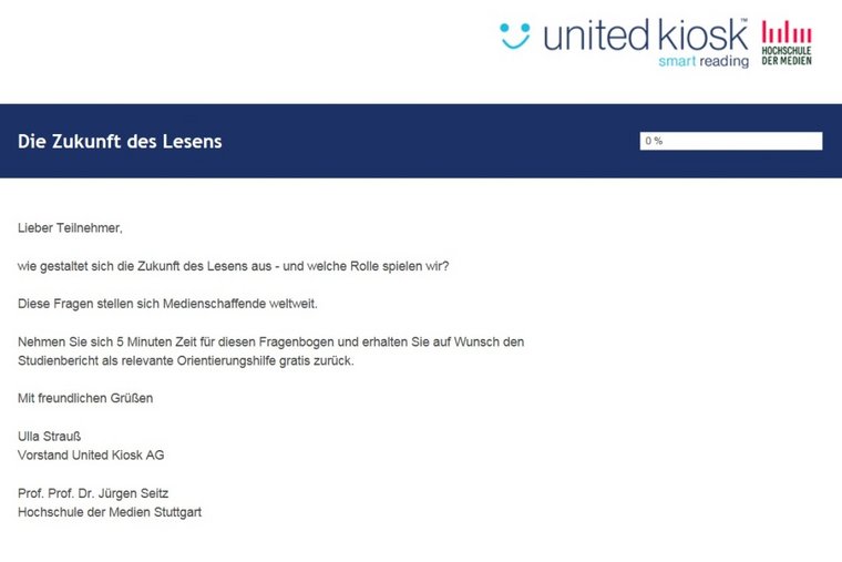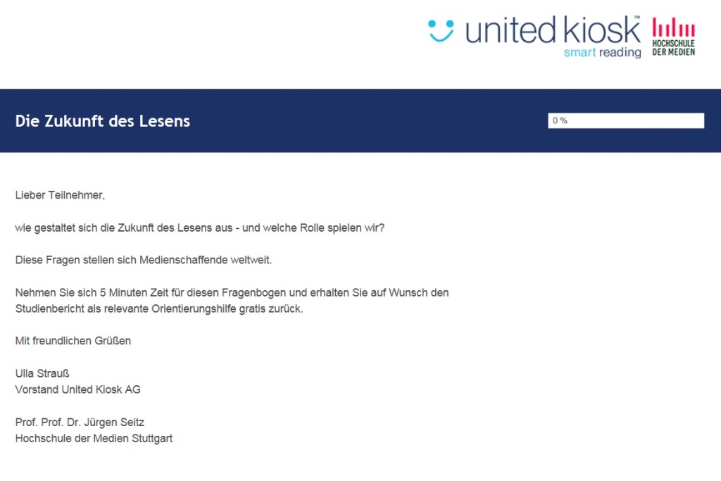 Wie gestaltet sich die Zukunft des Lesens – und welche Rolle spielen Medienschaffende darin? Eine aktuelle Umfrage der Hochschule der Medien in Stuttgart gemeinsam mit United Kiosk untersucht Marktentwicklung und Erfolgsfaktoren für Medienunternehmen sowie das Konsumentenverhalten und die Zahlungsbereitschaft digitaler Leser.