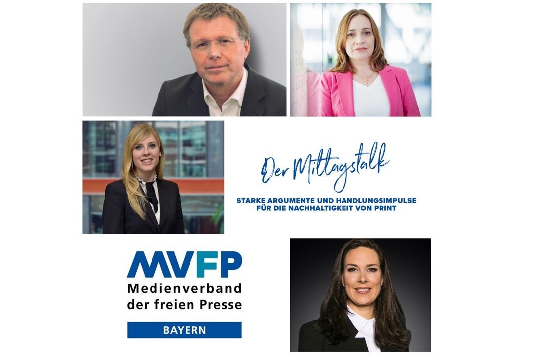 München 22. November 2023. „Wir stehen vor der Herausforderung, wirtschaftlich erfolgreich und gleichzeitig verantwortungsvoll mit unseren Ressourcen umzugehen. Es geht darum, klima- und umweltpolitische Herausforderungen anzunehmen und die Medienbranche nachhaltig zu gestalten“, betonte Horst Ohligschläger, Erster Vorsitzender des MVFP Bayern und CEO Roularta Media Deutschland, vor zahlreichen Teilnehmerinnen und Teilnehmern des digitalen Mittagstalks zum Thema: „Starke Argumente und Handlungsimpulse für die Nachhaltigkeit von Print“, durch den er gemeinsam mit der Geschäftsführerin der bayerischen Landesvertretung des MVFP, Anina Veigel, führte. Im Gespräch mit dem MVFP Bayern diskutierten Anne Karoline Frizen, Head of Corporate Development bei Hubert Burda Media, und Gundula Ullah, Head of Sustainability bei der FUNKE Mediengruppe, wie Nachhaltigkeitsziele in die Unternehmensstrategien und in die täglichen Betriebsabläufe integriert werden können.