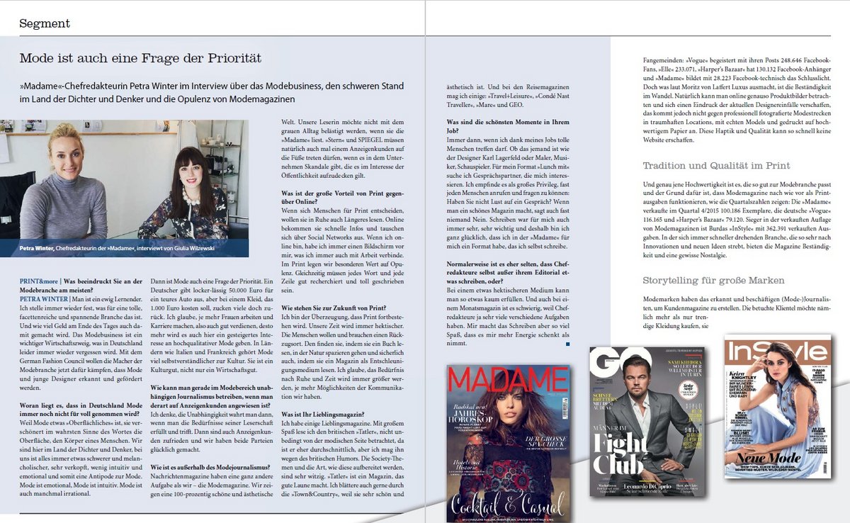 Wie wichtig Online ist, wissen auch die hiesigen Modezeitschriften. Alle haben sie große Websites und zahlreiche Facebook- und Instagram-Fangemeinden: "Vogue" begeistert mit ihren Posts 248.646 Facebook-Fans, "Elle" 233.071, "Harper's Bazaar" hat 130.132 Facebook-Anhänger und "Madame" bildet mit 28.223 Facebook-technisch das Schlusslicht. Doch was laut Moritz von Laffert Luxus ausmacht, ist die Beständigkeit im Wandel. Natürlich kann man online genauso Produktbilder betrachten und sich einen Eindruck der aktuellen Designereinfälle verschaffen, das kommt jedoch nicht gegen professionell fotografierte Modestrecken in traumhaften Locations, mit echten Models und gedruckt auf hochwertigem Papier an. Diese Haptik und Qualität kann so schnell keine Website erschaffen.