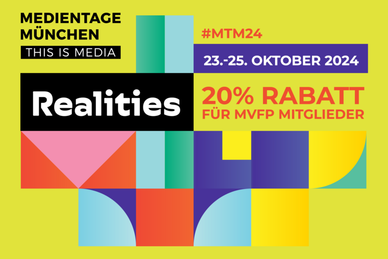 Mitglieder des MVFP Bayern erhalten im Rahmen einer exklusiven Kooperation mit den MEDIENTAGEN MÜNCHEN 20% Rabatt auf das Kongressticket.