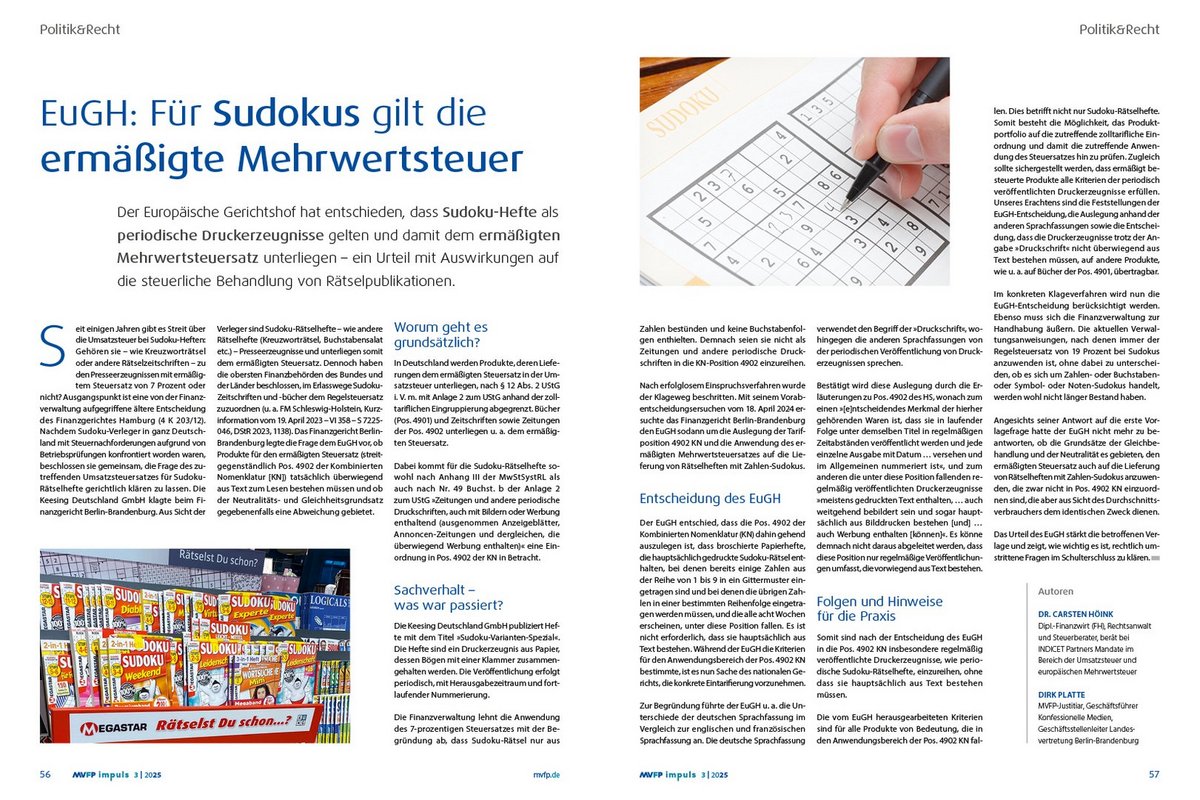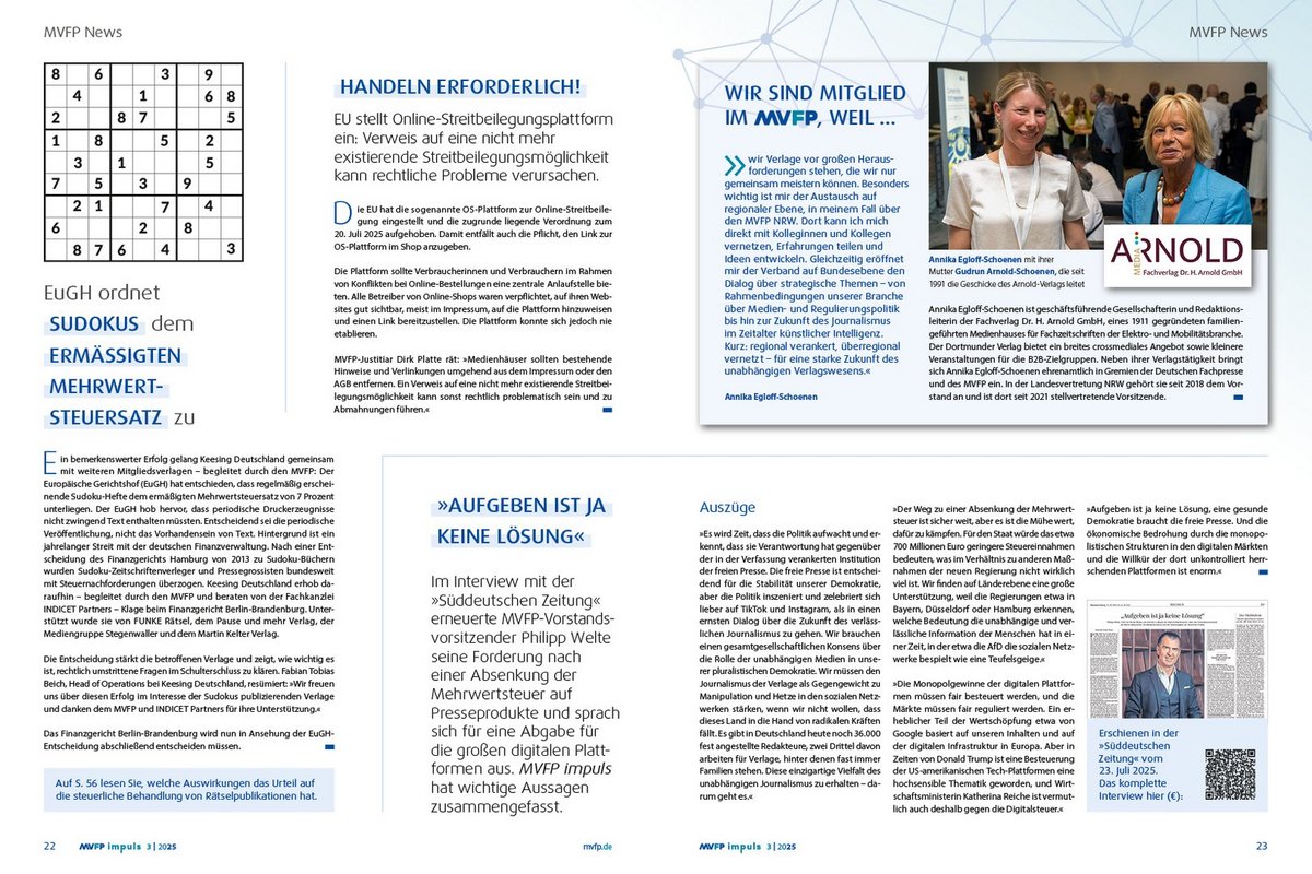 Die aktuelle Marktentwicklung zeigt, wie stark global agierende Plattformen den Wettbewerb verzerren. Doch regulatorische Eingriffe sind möglich und wirksam – so etwa die Entscheidung der EU-Kommission gegen Googles Dominanz im Bereich AdTech (S. 20). Auch das jüngste EuGH-Urteil, dass Sudoku-Hefte der reduzierten Mehrwertsteuer unterliegen (S. 22, 56), steht beispielhaft für den medienpolitischen Erfolg gemeinsamen Handelns. Die Ausgabe setzt damit Impulse für den politischen Dialog: eine freie Presse braucht faire Wettbewerbsbedingungen, Vielfaltssicherung und klare politische Unterstützung.