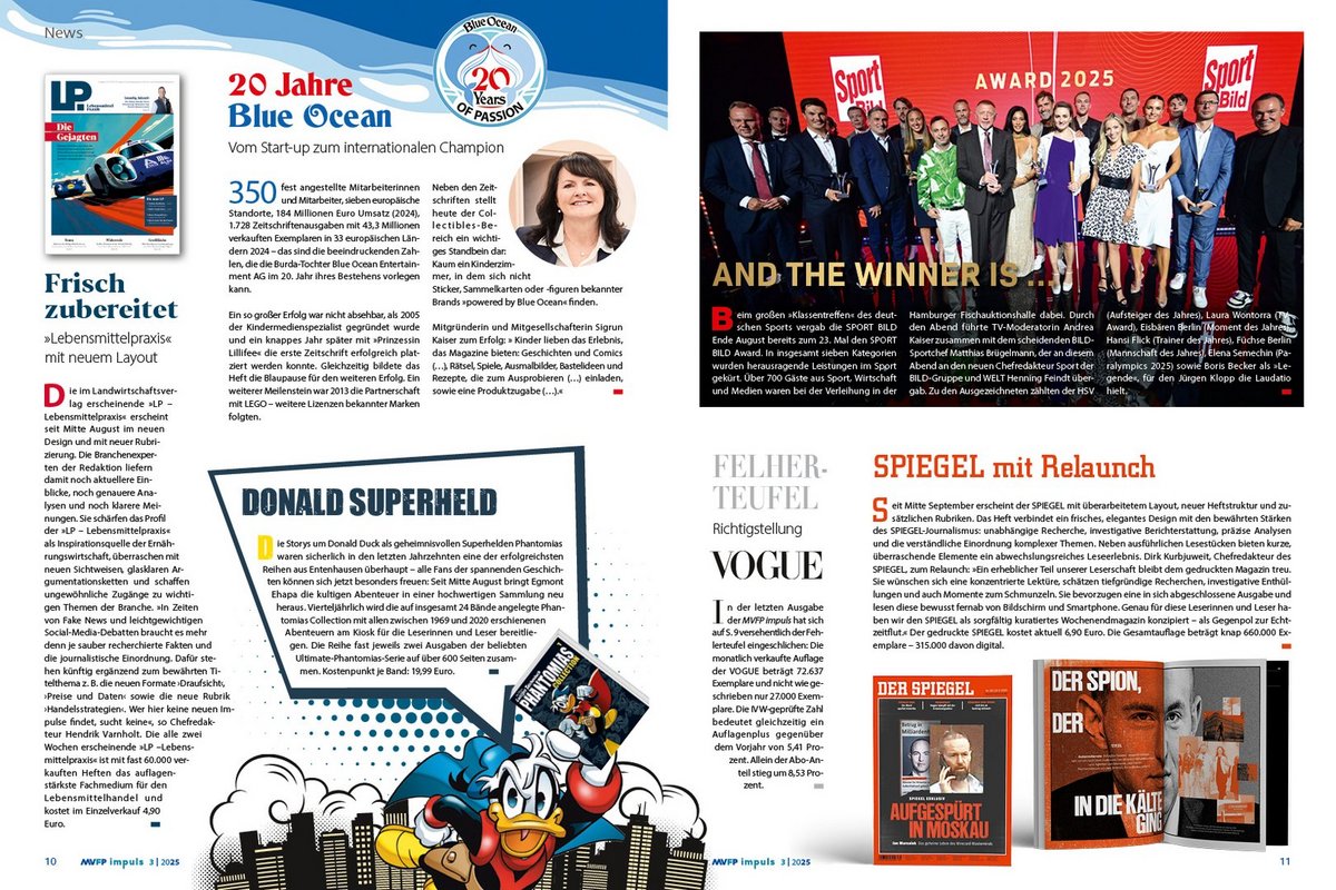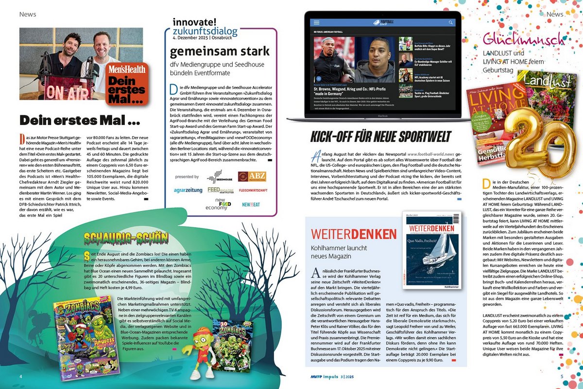 Die neue Ausgabe vonMVFP impulspräsentiert sich als bunter Querschnitt durch die Themen, die Verlage aktuell bewegen: Auf 80 Seiten finden sich vielfältige Themen, zahlreiche Stimmen und unterschiedliche Blickwinkel, die ein facettenreiches Bild der Branche zeichnen.
