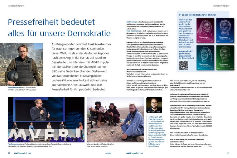 Der stellvertretende BILD-Chefredakteur Paul Ronzheimer berichtet als Kriegsreporter für Axel Springer aus Krisengebieten und war nach dem Terrorangriff der Hamas auf Israel als erster deutscher Reporter vor Ort im Gazastreifen. Im Interview mit MVFP impuls spricht er über die Arbeit von Korrespondentinnen und Korrespondenten in Krisengebieten, wie Verlage erfolgreich in Krisenberichterstattung investieren und Kolleginnen und Kollegen vor Ort unterstützen können. Auf die Frage, was ihm die Pressefreiheit persönlich bedeutet, antwortet Paul Ronzheimer: „Diese Freiheit bedeutet alles für unsere Demokratie.“