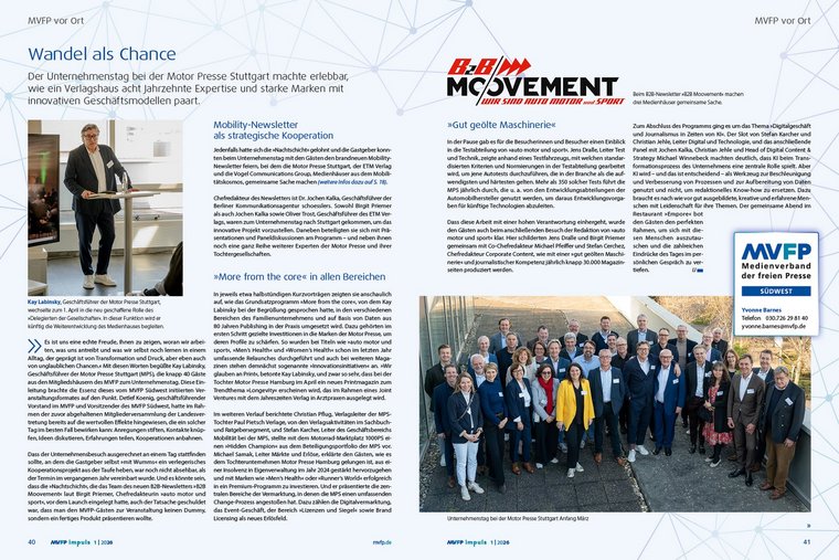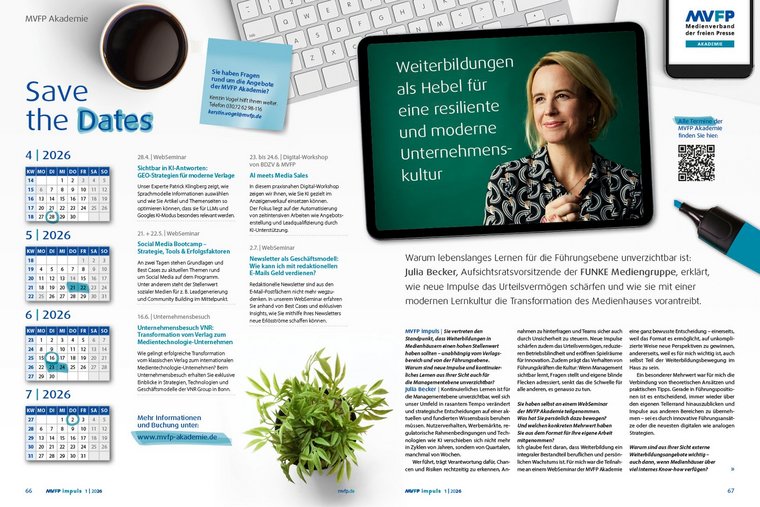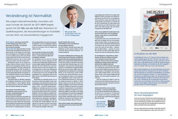 Ein Beispiel für erfolgreiche Wandlungsfähigkeit zeigt das Verlagsporträt zum 80-jährigen Jubiläum der ZEIT (S. 58). Nils von der Kall, seit Februar 2026 CEO der ZEIT, beschreibt im Interview mit MVFP impuls, wie Unternehmenskultur, Innovation und neue Formate die Zukunft des Hamburger Medienhauses prägen: „Das ,ZEIT-Gefühl‘ verbindet die Neugier, den Problemen auf den Grund zu gehen, mit der Zuversicht, diese auch lösen zu können – zumindest langfristig.“