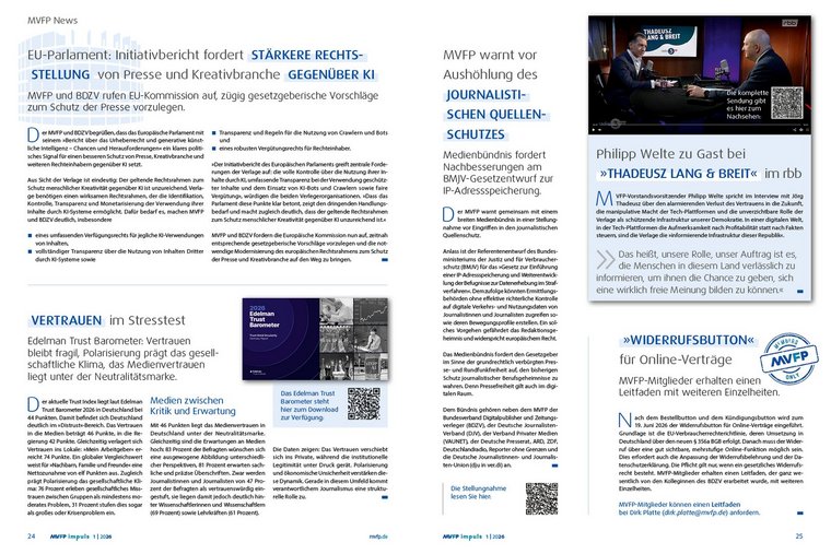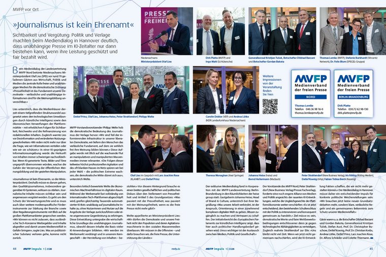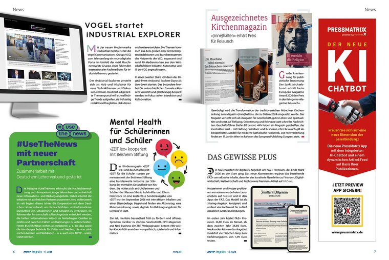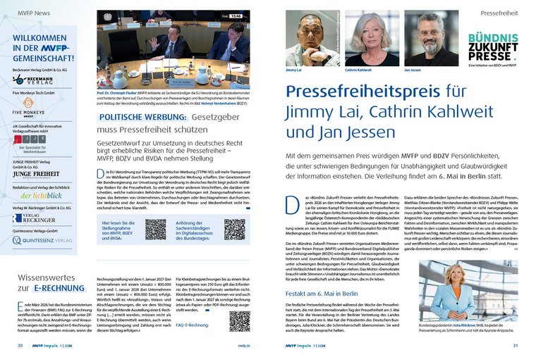 Die Ausgabe setzt darüber hinaus ein klares Zeichen für die Bedeutung von Pressefreiheit: MVFP und BDZV würdigen als Bündnis Zukunft Presse mit dem erstmals gemeinsam verliehenen Pressefreiheitspreis 2026 Jimmy Lai, Cathrin Kahlweit und Jan Jessen, die unter schwierigen Bedingungen für unabhängigen Journalismus einstehen (S. 31). Gleichzeitig rückt ein bundesweiter Aktionstag für Jugendliche die Stärkung von Informationskompetenz in den Fokus und zeigt, wie wichtig es ist, junge Menschen für den Wert freier Medien und einer konstruktiven Debattenkultur zu sensibilisieren (S. 32).