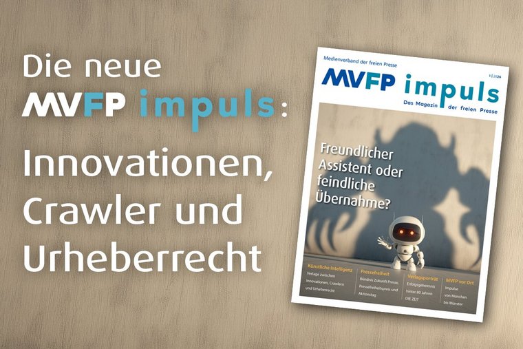 Die Frage „Freundlicher Assistent oder feindliche Übernahme?“ im Umgang mit künstlicher Intelligenz steht im Zentrum der Frühjahrsausgabe von MVFP impuls. Das 80-seitige Magazin zeigt, wie die Technologie einerseits als zentraler Treiber die gesamte Wertschöpfungskette der Verlage durchdringt, während Medienhäuser andererseits Gefahr laufen, zu reinen Datenlieferanten für KI-Anbieter zu werden.