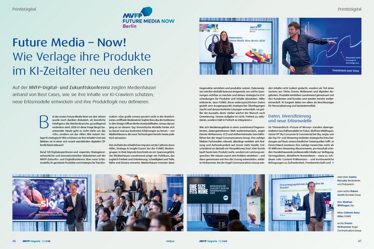 Die Ausgabe blickt auf die Zukunfts- und Digitalkonferenz des MVFP Future Media Now, auf der 120 Digitalexpertinnen, Strategieverantwortliche und Innovationstreiber der Branche über neue Wege diskutierten, um in einem radikal veränderten Marktumfeld nicht nur zu bestehen, sondern die Standards von morgen zu setzen (S. 46). Deutlich wurde: Neben technologischen Lösungen braucht es vor allem branchenweite Standards und regulatorische Unterstützung auch auf europäischer Ebene.