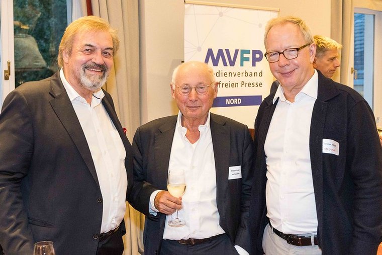 Mit einer eindeutigen Botschaft hat der Präses der Handelskammer Hamburg Prof. Norbert Aust auf dem Sommerfest der Landesvertretung Nord des Medienverbandes der freien Presse e.V. (MVFP) die Medienhäuser aufgefordert, sich zur Zukunftssicherung der freien Presse und Unterstützung der Zivilgesellschaft „auf und neben den großen Tech-Plattformen zu behaupten“. Redaktionelle Medien überzeugen mit Verlässlichkeit und Genauigkeit und sind so ein „Bollwerk“ gegen Desinformation. Die Medienbranche ist ein zentraler Wirtschaftsfaktor für den Standort Hamburg, so Prof. Aust vor rund 80 Gästen der Mitgliedsverlage des MVFP Nord aus Hamburg, Schleswig-Holstein, Niedersachsen, Bremen und Mecklenburg-Vorpommern. Abschließend forderte Prof. Aust die Medienbranche zur engen Zusammenarbeit auf, damit die Verlage von heute auch die Verlage von morgen sind.