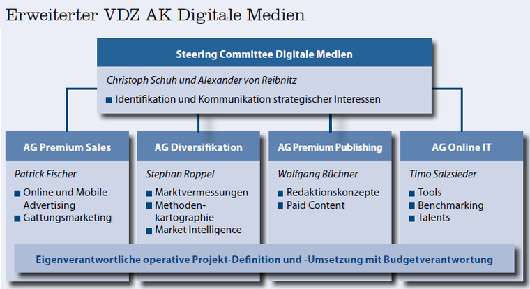 Geleitet wird der Arbeitskreis von Christoph Schuh, und Alexander von Reibnitz. Als Leiter der Arbeitsgruppen konnten Patrick Fischer, Director Digital bei Burda Intermedia Publishing (Premium Sales), Stephan Roppel (Diversifikation), Wolfgang Büchner, Chefredakteur dpa (Premium Publishing) und Timo Salzsieder, Geschäftsführer Tomorrow Focus Technologies (Online IT) gewonnen werden.