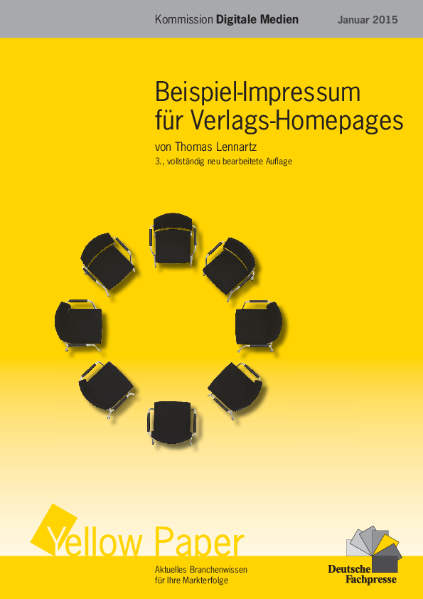 Das aktualisierte Yellow Paper der Kommission Digitale Medien"Beispiel-Impressum für Verlags-Homepages" erläutert anhand eines Praxisbeispiels die grundlegenden rechtlichen Rahmenbedingungen zur Impressumspflicht. Ein eigenes Kapitel gibt Hilfestellung, wie Verlage auch in Social-Media-Auftritten der Impressumspflicht gerecht werden können. Autor des Yellow Papers ist Assessor jur. Thomas Lennartz, Leiter Forschung und Entwicklung im NWB Verlag (Herne) und Mitglied der Kommission Digitale Medien der Deutschen Fachpresse. Die 3., vollständig neu bearbeitete Fassung des in 2007 erstmals erschienenen Yellow Papers umfasst 18 Seiten und steht Mitgliedern der Deutschen Fachpresse kostenlos zur Verfügung.
