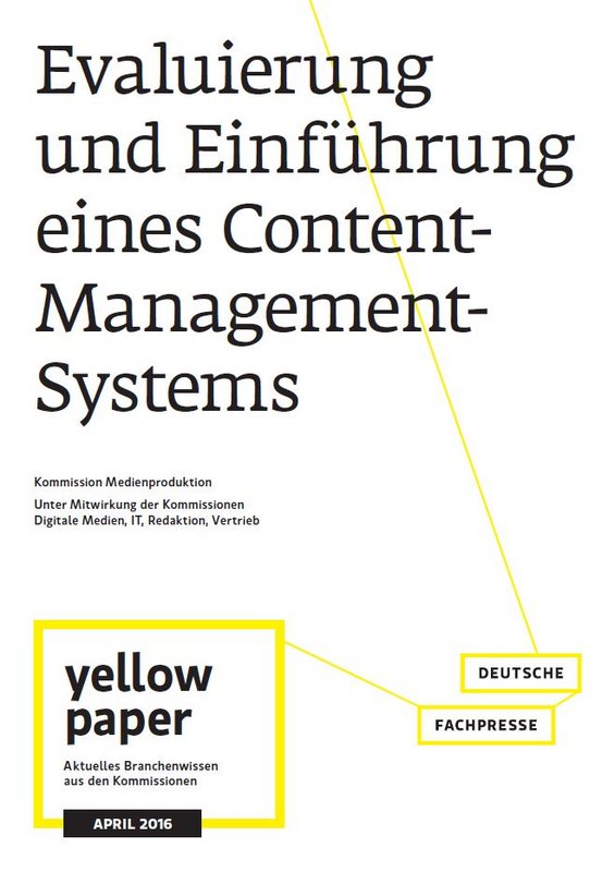 Seit 2006 publiziert die Deutsche Fachpresse unter dem Namen "Yellow Paper" eine Schriftenreihe zu aktuellen Themen für die Anbieter von Fachmedien. Die aktuelle Ausgabe "Evaluierung und Einführung eines Content-Management-Systems" (88 Seiten, DIN A4) liegt als PDF-Datei vor und kann bei Martina Seiring bestellt werden, Telefon: 069 / 1306-397, E-Mail: seiring(at)deutsche-fachpresse.de. Der Preis beträgt 129,00 Euro netto. Mitglieder der Deutschen Fachpresse erhalten das Yellow Paper kostenlos.