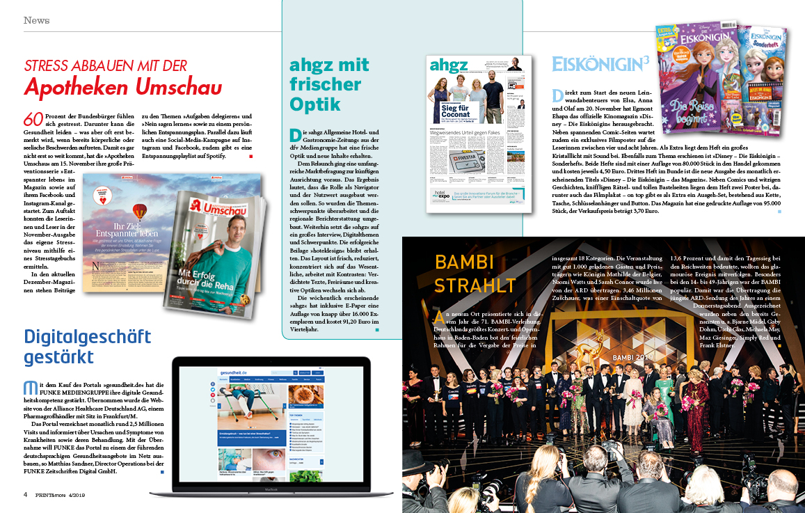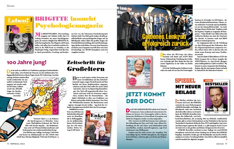 Die 4. Ausgabe der PRINT&more 2019 liefert darüber hinaus eine Übersicht über die Entwicklungen der Branche auf knapp 20 Seiten mit 40 Meldungen und Neuvorstellungen aus den deutschen Verlagshäusern. Diese ergänzen Experteninterviews und Gastbeiträge. Ob die neuesten Trends am Point Of Sale (VDZ-Initiative „Presseregal der Zukunft“), ein Aufruf zum Schülerwettbewerb zum Tag der Pressefreiheit 2020 oder Neuigkeiten aus den Fach- und Landesverbänden des VDZ – die PRINT&more ist ein Spiegel der Branche, und das Themenportfolio ist breit.