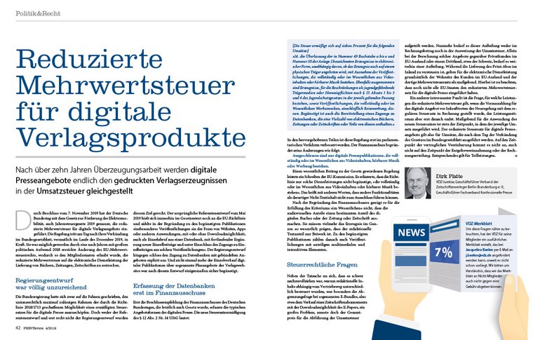 Nach über zehn Jahren Überzeugungsarbeit werden digitale Presseangebote den gedruckten Verlagserzeugnissen in der Umsatzsteuer gleichgestellt. VDZ-Justitiar Dirk Platte erläutert, was nun aus steuerrechtlicher Sicht wichtig wird.