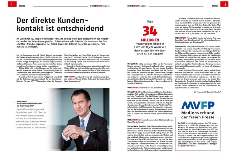 Im Dezember 2022 wurde der Burda-Vorstand Philipp Welte zum Vorsitzenden des Medienverbandes der freien Presse gewählt. Er hat seitdem sehr intensiv die Interessen der Zeitschriften-Branche gegenüber der Politik sowie den Internet-Giganten wie Google, Facebook & Co. vertreten.