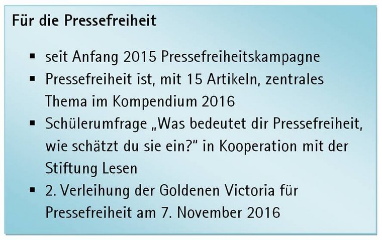Im diesjährigen Kompendium des VDZ ist das Thema Pressefreiheit mit 13 Artikeln erneut eines der zentralen Themen.