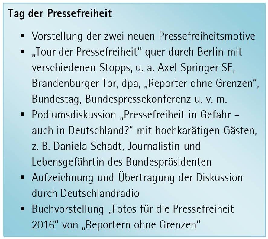 Gemeinsam mit "Reporter ohne Grenzen" und der Stiftung Lesen setzte der VDZ bei der Abendveranstaltung am 3. Mai ein deutliches Signal, um die herausragende Bedeutung der Pressevielfalt und Meinungsfreiheit zu untermauern, und lud zu diesem Anlass zu einer Podiumsdiskussion mit dem Titel "Pressefreiheit in Gefahr – auch in Deutschland?" und der Vorstellung des neuen Buches "Fotos für die Pressefreiheit 2016" von "Reportern ohne Grenzen". Die jährliche Buchserie dokumentiert in Bildern und Texten die Ereignisse des vergangenen Jahres und führt den Leser an Brennpunkte der Pressefreiheit. Ziel des Abends war es, das Bewusstsein zu schärfen, dass die Pressefreiheit auch in Europa herausgefordert wird und gefährdet ist, und die Bereitschaft zu erhöhen, diese bedingungslos und täglich aufs Neue zu verteidigen.