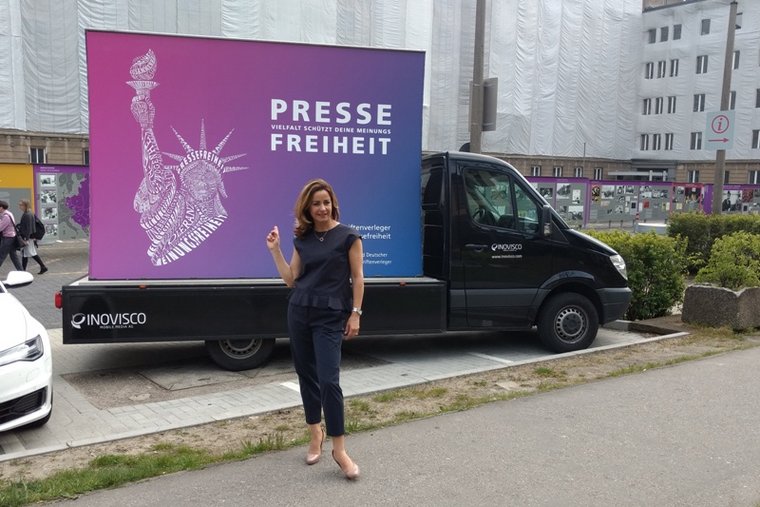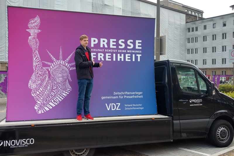 Bereits gestern hatte der VDZ eine Redaktionstour durch Berlin unternommen und unter andrem Cicero, dpa, Egmont Ehapa, Focus, Funke und SPIEGEL mit dem neuen Pressefreiheitsmotiv besucht. Der VDZ warb auf den Straßen Berlins mit der neuen Anzeige seiner Pressefreiheitskampagne für eine unabhängige freiheitliche Presse. Der Claim „Pressevielfalt schützt Deine Meinungsfreiheit“ macht auf den großen Stellenwert von Medien für die Demokratie aufmerksam. „Es geht um die Freiheit von allen Bürgern, ihre Meinung sagen zu können“, verdeutlichte VDZ-Hauptgeschäftsführer Stephan Scherzer. „Die Pressefreiheit ist stets der erste Damm, der gebrochen wird, das sehen wir gerade in der Türkei. Dann folgen Meinungsfreiheit, Kunstfreiheit, Religionsfreiheit und Wissenschaftsfreiheit. Unsere Demokratie und unser Wohlstand gedeihen aber genau aufgrund dieser Werte.“