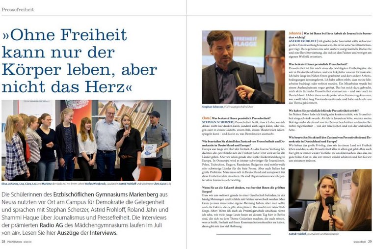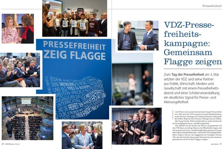 „Pressefreiheit – Zeig Flagge!“ – so lautet das Motto der diesjährigen Pressefreiheitskampagne des VDZ. Auf 16 Seiten und mit vielen Fotos berichten wir in der PRINT&more 2/2019 über den großen VDZ-Pressefreiheitsabend im Allianz Forum am Pariser Platz und unseren bundesweiten Schülerwettbewerb zum Thema Pressefreiheit. Warum wirtschaftliche Unabhängigkeit Voraussetzung für Pressefreiheit ist, beschreibt VDZ-Präsident Dr. Rudolf Thiemann in seinem Beitrag.