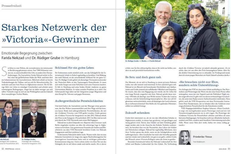 In Hamburg kam es zu einem emotionalen Treffen zwischen der afghanischen Journalistin Farida Nekzad und Ex-Deutsche Bahnchef Dr. Rüdiger Grube, beide Preisträger der „Goldenen Victoria“. Rüdiger Grube übernimmt einen Teil des Schulgeldes für Faridas Tochter Muska in Afghanistan. Eine Begegnung, die uns zeigt: Das VDZ-Netzwerk ist stark, hilft und wirkt.