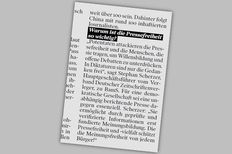 "Potentaten attackieren die Pressefreiheit und die Menschen, die sie tragen, um Willensbildung und offene Debatten zu unterdrücken. In Diktaturen sind nur die Gedanken frei", sagt Stephan Scherzer, Hauptgeschäftsführer vom Verband Deutscher Zeitschriftenverleger, zu BamS.