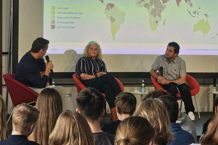 „Ohne eine freie Presse kann es keine Demokratie geben!“, sagte Anwar Shah darüber, was ihm Pressefreiheit bedeutet. Und er appellierte an die Jugendlichen: „Ein Land braucht Journalisten und Journalistinnen! Nutzt eure Möglichkeiten.“ Und auch Amelie Marie Weber führte dazu aus: „Wir müssten wie kleine Kinder noch viel mehr nach dem „Warum“ in und hinter der Story fragen.“ Und sagte über den Wert von #PressefreiheitIstDeineFreiheit: „Ich liebe diesen Beruf. Wir brauchen gute Journalisten und Journalistinnen. Wir brauchen Pressefreiheit.“