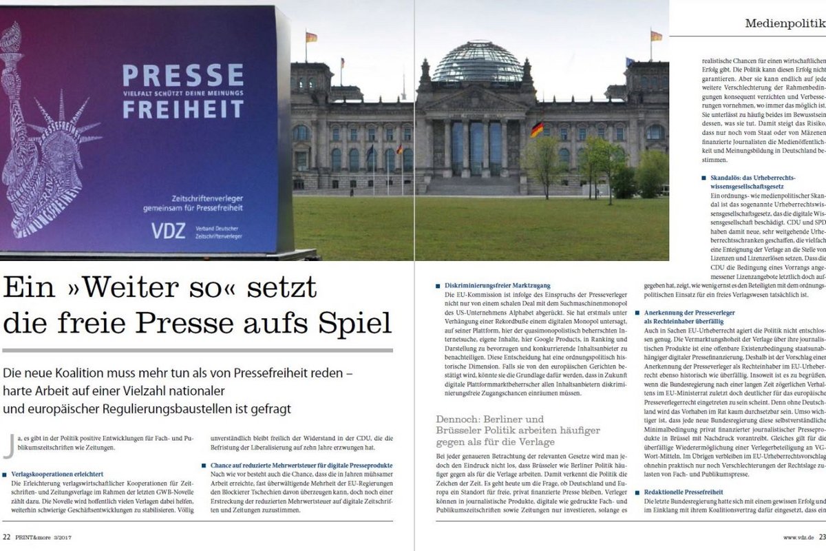 „Die Welt ist komplex, einfache Antworten sind selten“, so VDZ-Hauptgeschäftsführer Stephan Scherzer im Editorial. „Die politischen Entscheider in Berlin sind mit der herausfordernden Situation konfrontiert, verantwortungsvoll eine tragfähige Regierung zu bilden, die den geballten Herausforderungen und Chancen unserer Zeit entgegentreten kann“.